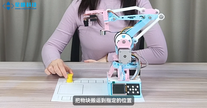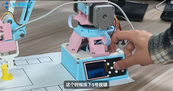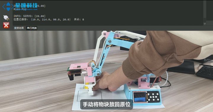 使用按键控制机械臂完成物块的搬运工作,并使用5号按键记录过程中的坐标点。 完成搬运后,手动将物块放回原位,按下两次5号按键开始示教回放。