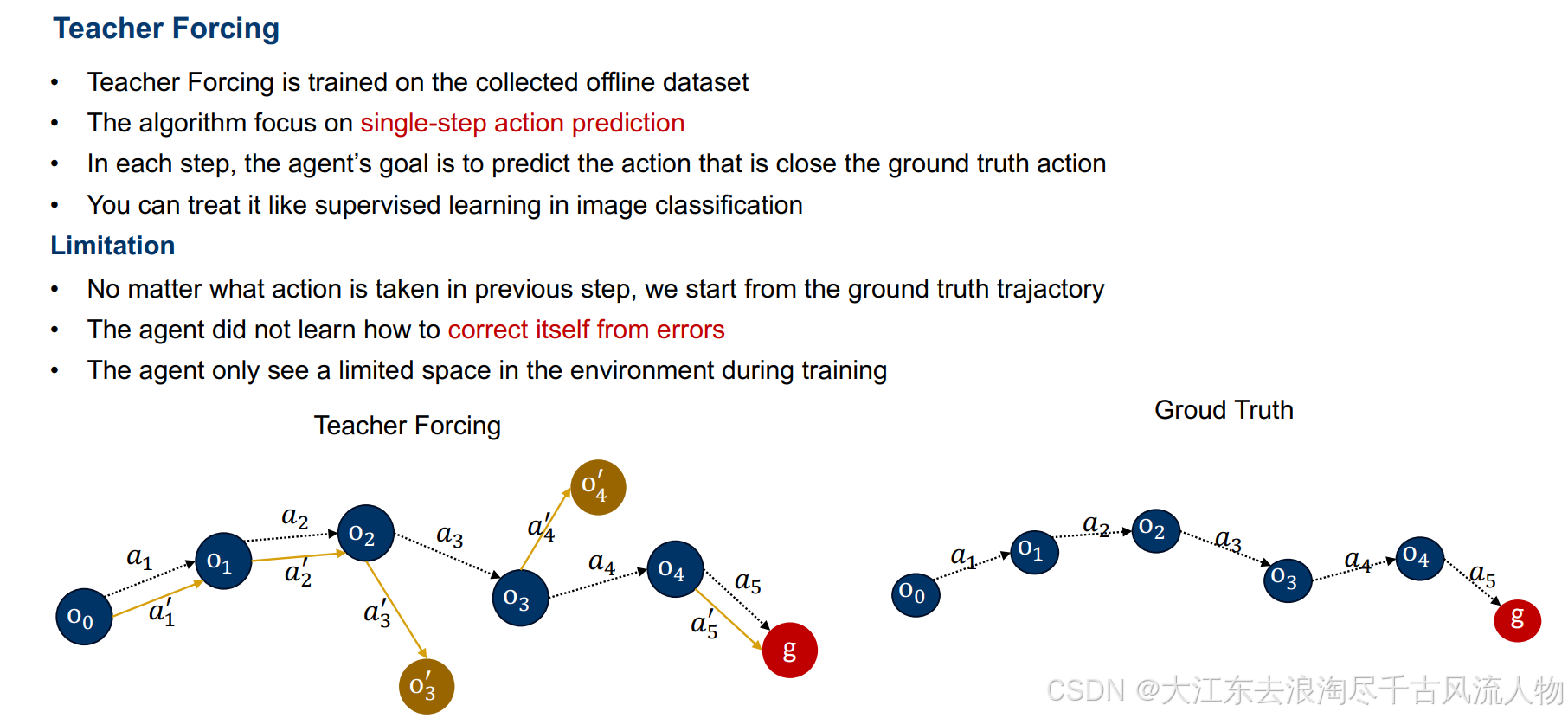| Teacher-forcing | 专家离线演示 | 稳定、快收敛 | 暴露偏差、测试崩 |