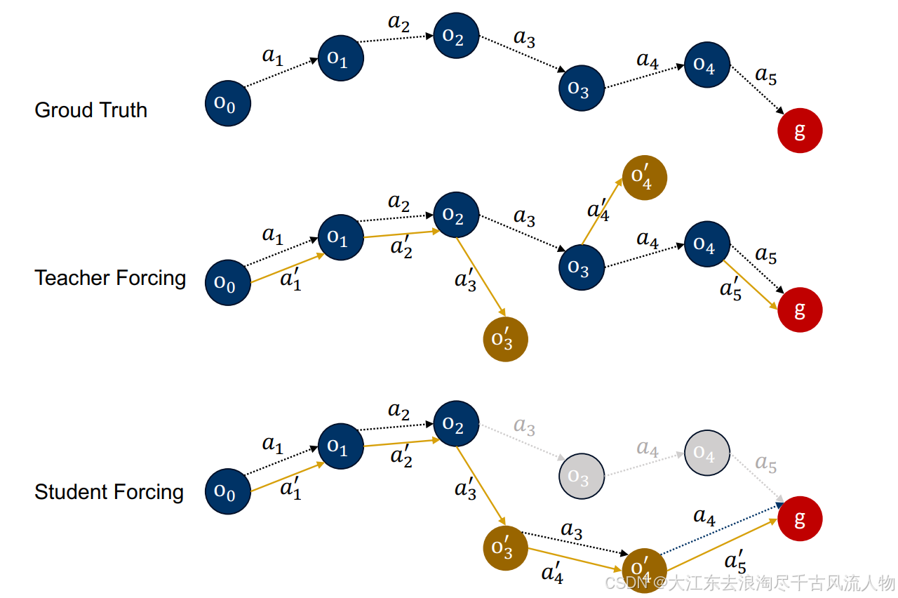 - Student-forcing(学生强制) :每一步输入 = 模型自己上一步动作产生的新状态(在线、闭环交互)