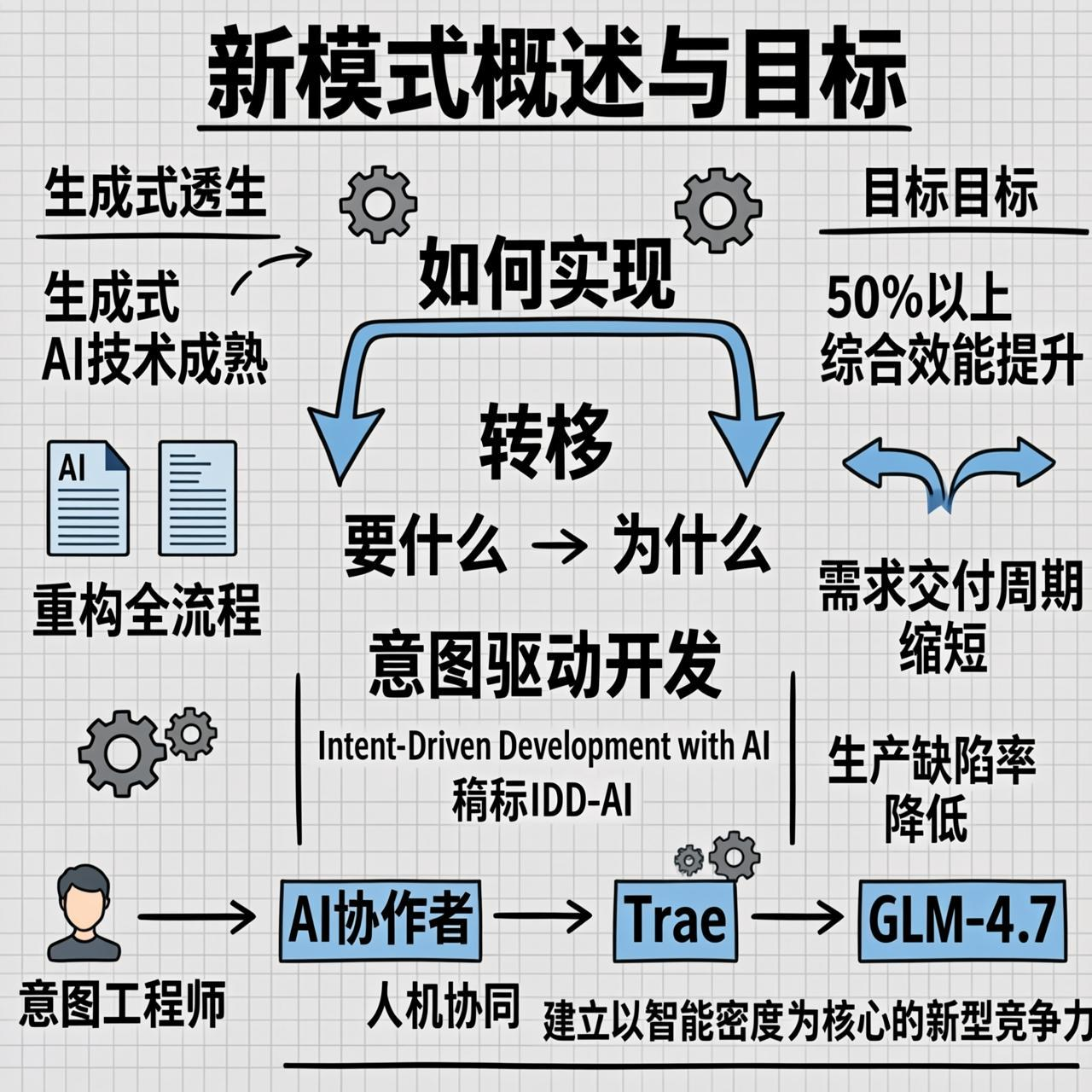 具体而言,IDD-AI模式的目标是实现从"人力密集"向"智能密集"的根本性转型。通过引入意图工程师、AI协作者等新角色,并依托Trae智能化开发平台与GLM-4.7大模型的深度集成,该模式致力于重构需求分析、方案设计、代码实现、测试验证乃至部署运维的全链路。其量化目标是通过这一系统性变革,实现50%以上综合效能提升,具体体现在需求交付周期大幅缩短、生产缺陷率显著降低、单位人力资源产出倍增等多个维度,最终推动组织建立起以"智能密度"为核心的新型竞争力。