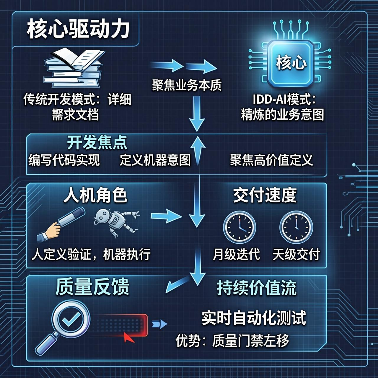 IDD-AI诞生的背景,是生成式AI技术(特别是大语言模型)的成熟,使得机器能够深刻理解人类意图并生成复杂、可用的软件制品成为可能。这为重构从需求到上线的全流程提供了技术基础。该模式旨在通过"人机协同"的深度再造,将人类从重复性、低层次的实现劳动中解放出来,转而专注于高价值的意图提炼、方案决策与价值验证,从而显著提升软件开发的交付效率、生产质量与业务响应速度。