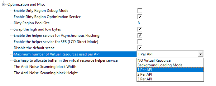 在工程管理器中展开 Acceleration ,并找到arm_2d_disp_adapter_0.h, 通过Configuraion Wizard 打开图形配置界面,在下拉列表"Maximum number of Virtual Resources used per API**" 中勾选除"NO Virtual Resource"以外的选项后保存,比如 1 per API。**