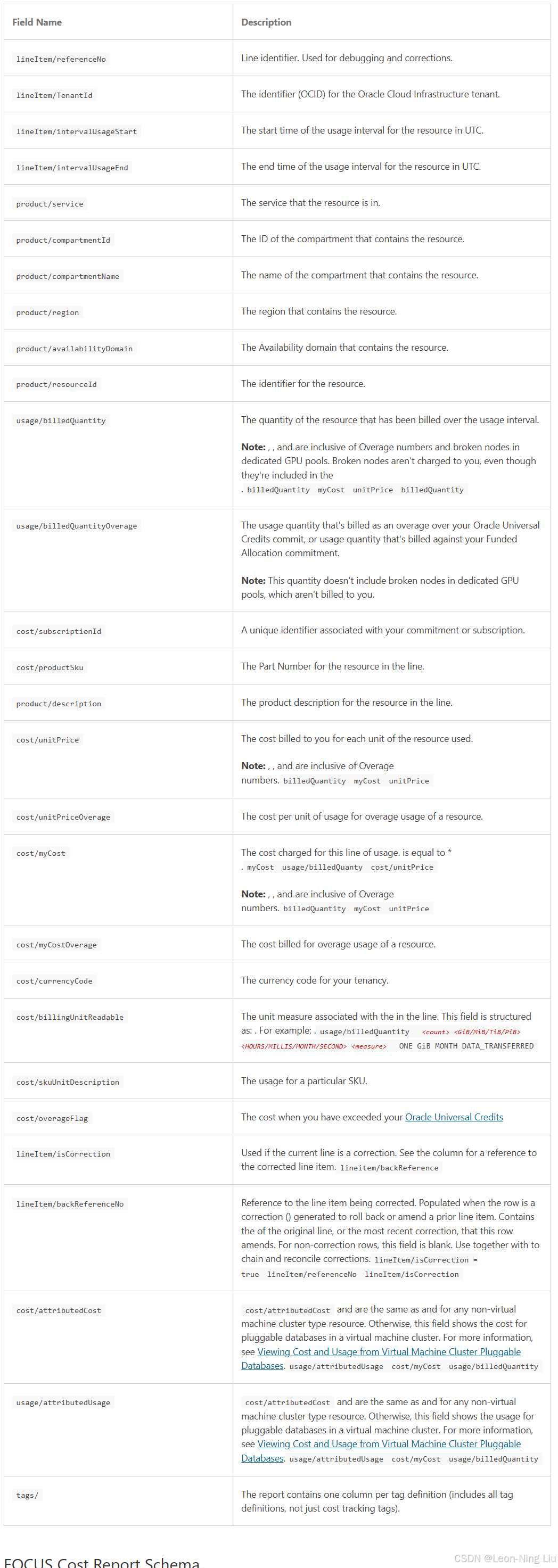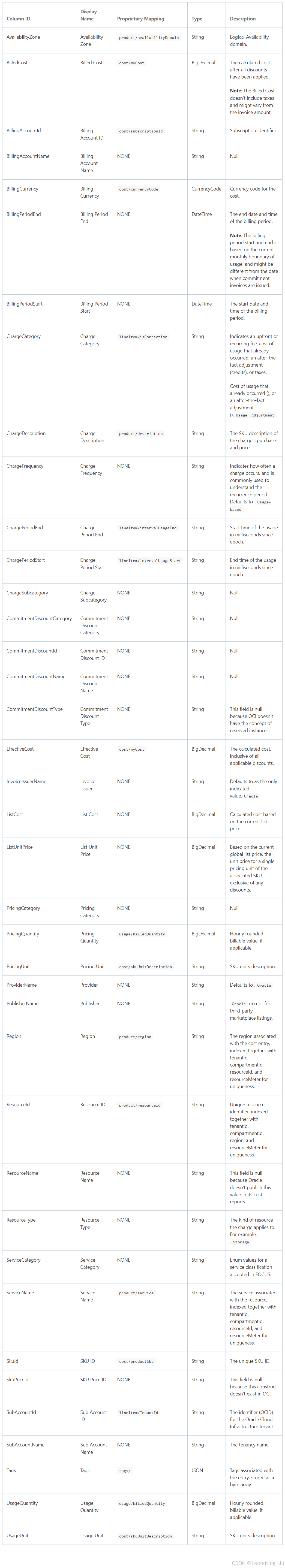 下表展示了FOCUS成本报告模式,包括与OCI专有成本报告模式的映射。