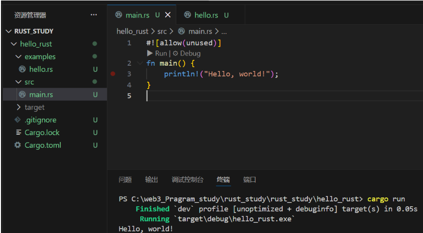 src/此目录存放着您项目的源代码。src/main.rs对于二进制(可执行)应用程序,这是默认的主源文件。cargo init它使用一个简单的"Hello, world!"程序创建: