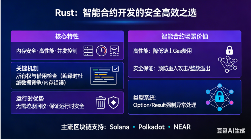 Rust是一门以内存安全、高性能和并发控制 为核心的系统级编程语言,其独特的所有权和借用检查机制 能在编译时从根本上杜绝数据竞争和内存错误(如缓冲区溢出),无需垃圾回收即可保证运行时安全。在智能合约开发中,这些特性至关重要:Rust的高性能与极小运行时开销能显著降低链上执行成本(Gas费用) ;其编译时安全保证能有效预防重入攻击、整数溢出等常见合约漏洞 ,大幅提升代码可靠性;同时,强大的类型系统和模式匹配(如Option/Result)强制开发者处理所有异常状态,减少了逻辑缺陷。因此,Rust已成为许多主流区块链(如Solana、Polkadot、NEAR)的智能合约首选语言,为构建安全、高效且复杂的去中心化应用提供了坚实基础。