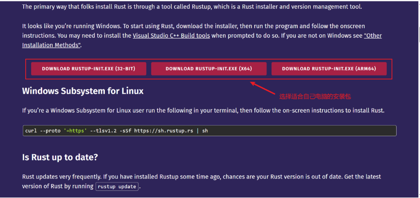 (3)向下滚动至标题为"Rustup:Rust 安装程序和版本管理工具"的部分。Rustup 是安装 Rust 的推荐方法,因为它能够管理不同的 Rust 版本及其相关工具。