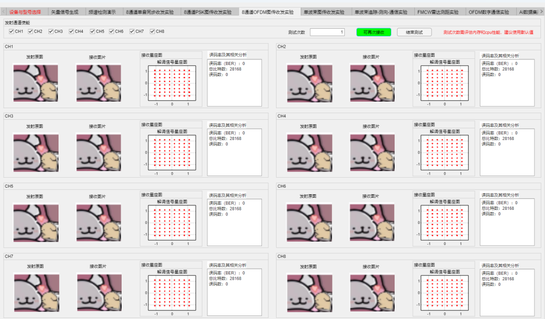 - 信号与图像可视化区: 实时呈现8通道收发图像、星座图,直观判断 OFDM传输质量;
