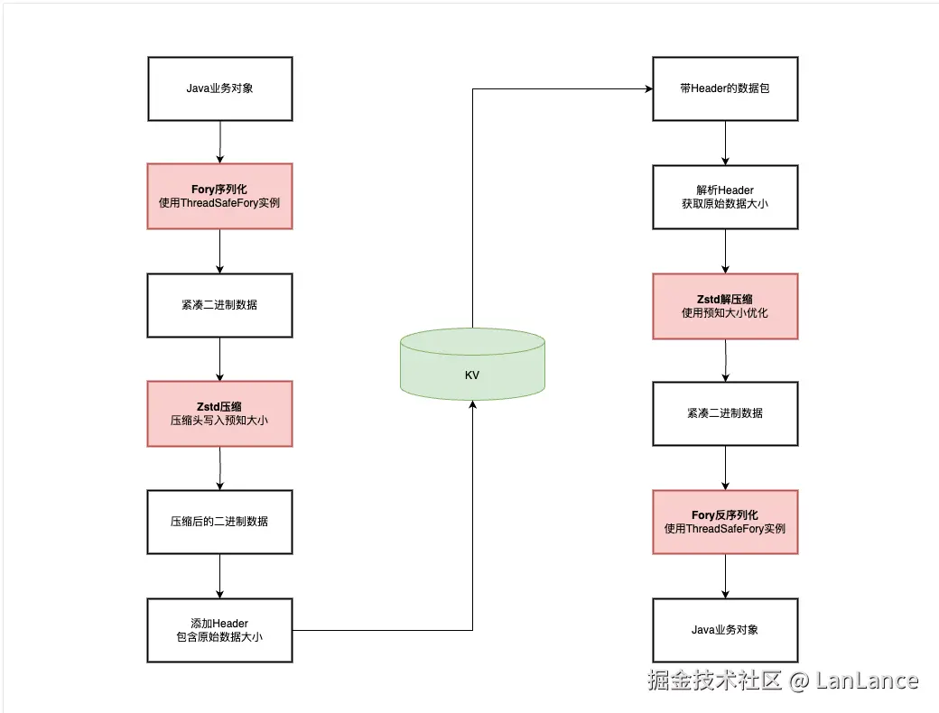 为了解决这一痛点,同时不牺牲系统的吞吐能力,针对性地设计出了一套基于 Fory 序列化与 Zstd 压缩的组合方案。这套方案的核心逻辑在于:利用 Fory 的极致性能解决序列化带来的 CPU 和耗时问题,利用 Zstd 的高压缩比与解压速度解决 KV 存储的大 Value 问题。