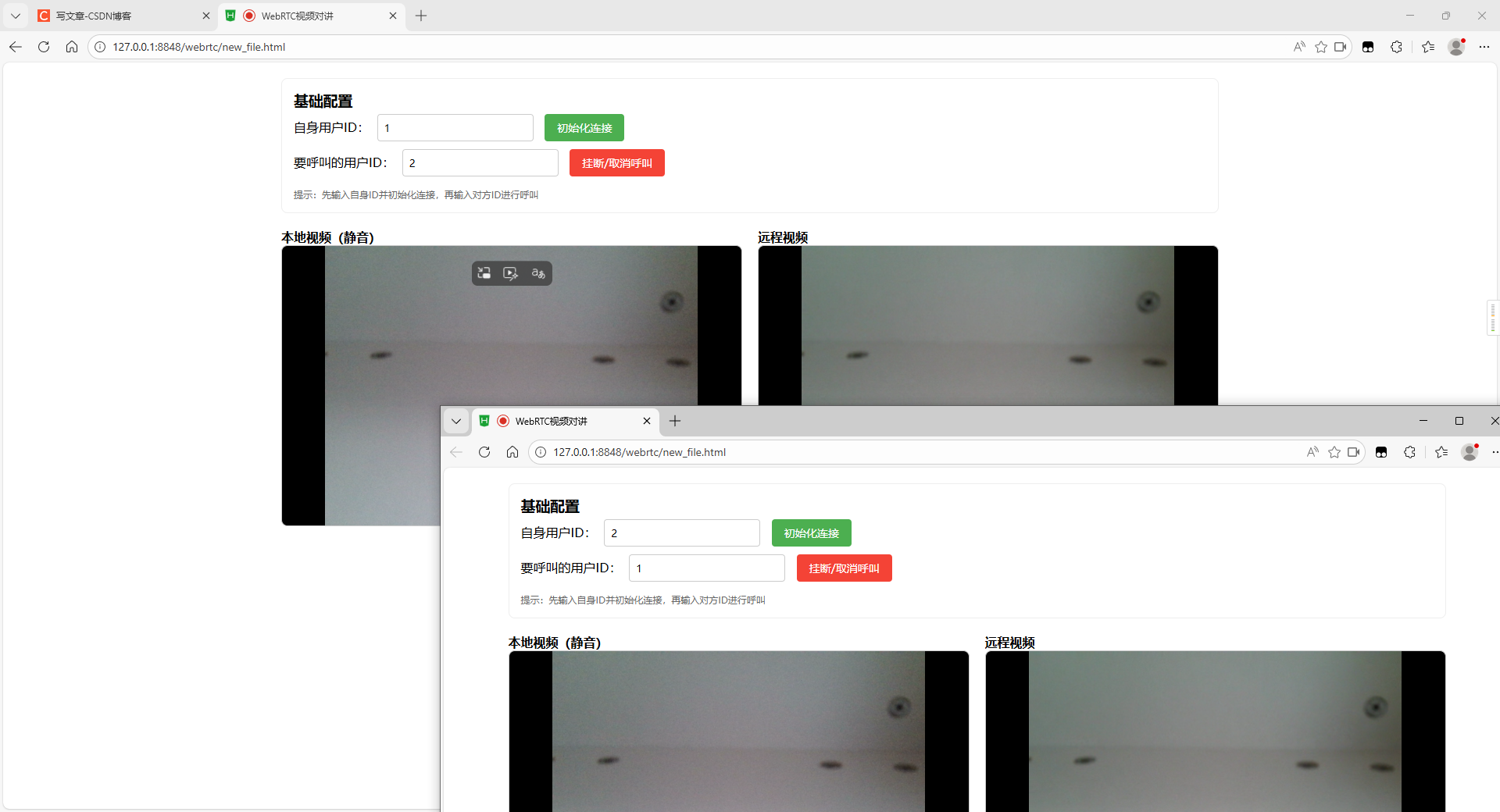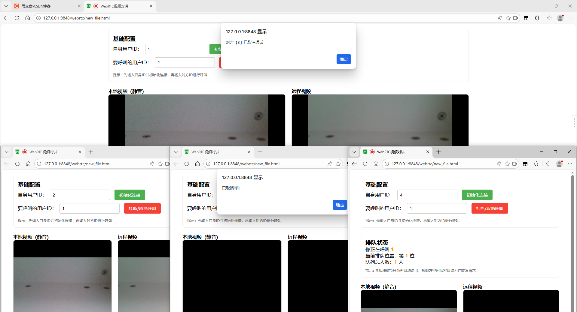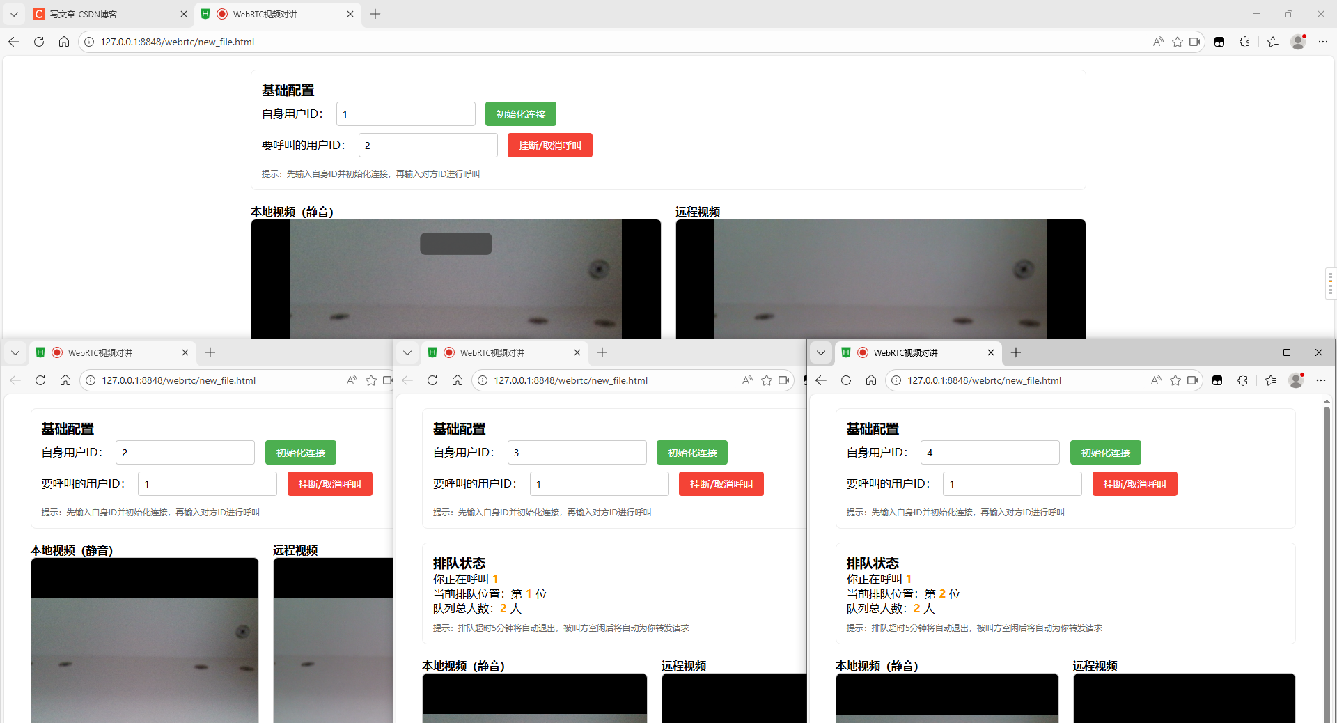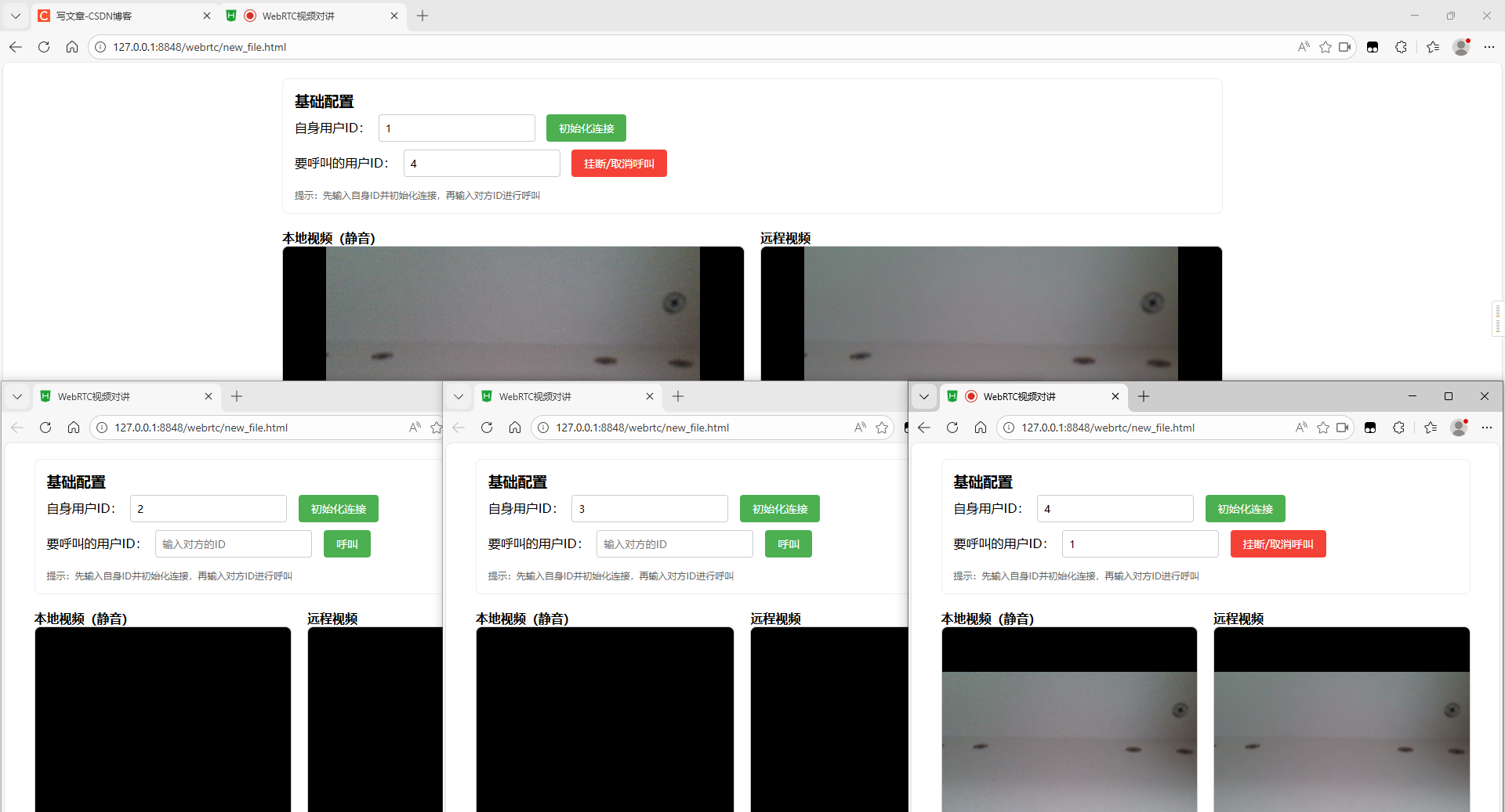 创建了4个浏览器分别登录不同的id,用来模拟一对一呼叫和多对一呼叫的情况