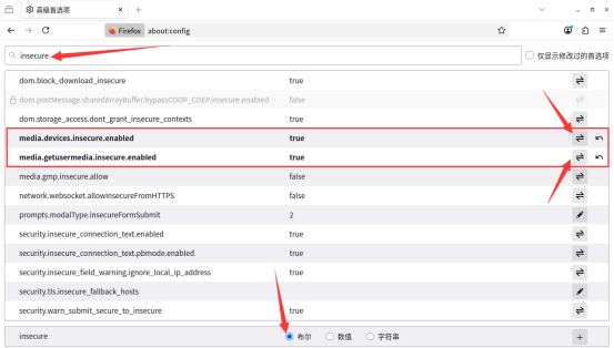找到【media.devices.insecure.enabled】和【media.getusermedia.insecure.enabled】,点击后面的切换按钮,把值改为true后刷新页面