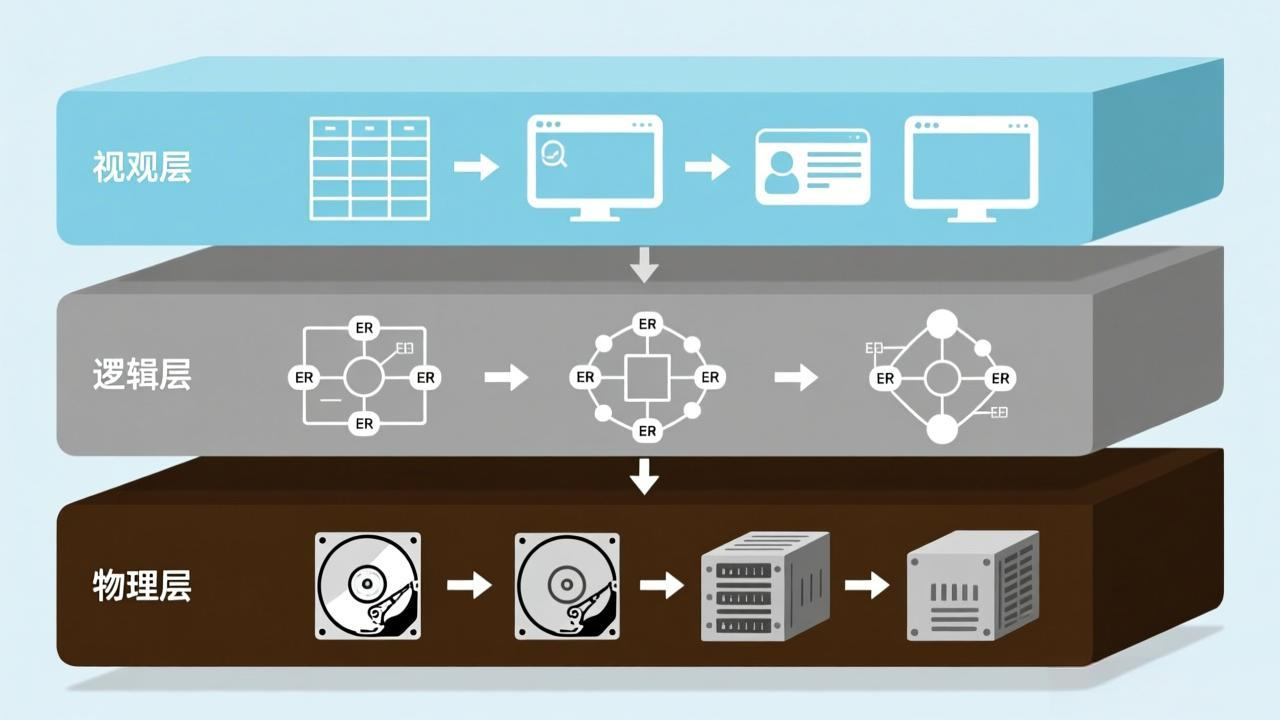 - (3)物理层 (Physical Level) 是最低层次的抽象,描述数据在存储器中是如何存储的。物理层详细地描述复杂的底层结构。