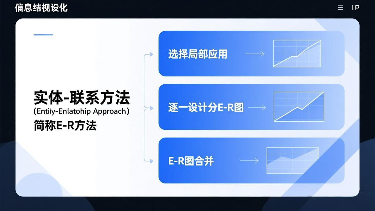 概念结构设计 最著名最常用的方法是:实体-联系方法 (EntityRelationship Approach), 简称E-R方法 。工作步骤 包括:选择局部应用、逐一设计分E-R图和E-R 图合并。
