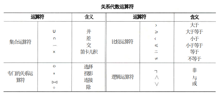 - 关系操作的特点 是操作对象和操作结果都是集合。关系代数运算符 有4类:集合运算符、专门的关系运算符、算术比较符和逻辑运算符 。
