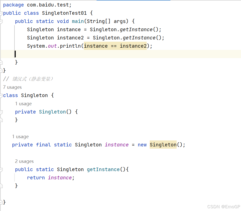 优点:这种写法比较简单,就是在类装载的时候就完成了实例化,避免了线程同步问题