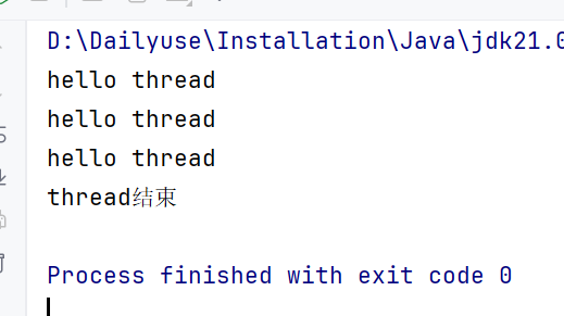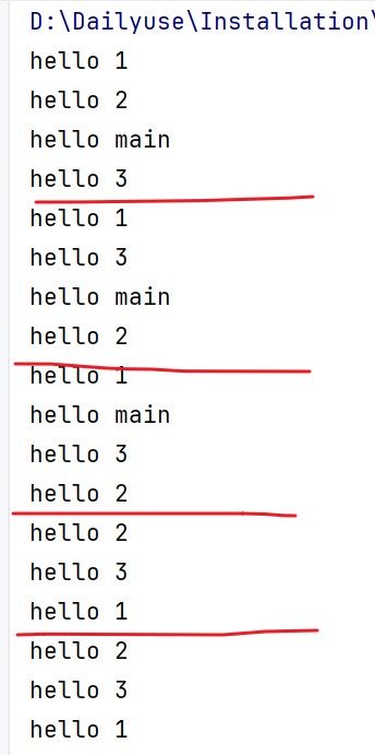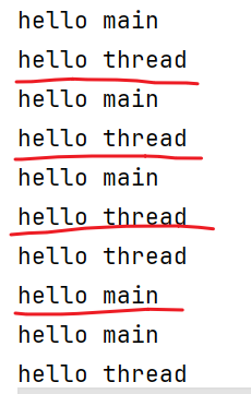 在执行结果中,hello main与hello thread有先有后,因为:多个线程调度顺序是随机的(操作系统剥夺式调度线程),这两个线程谁先谁后执行都有可能,无法预测。