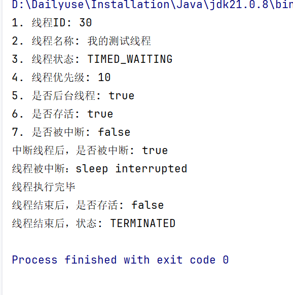 System.out.println("7. 是否被中断: " + myThread.isInterrupted());