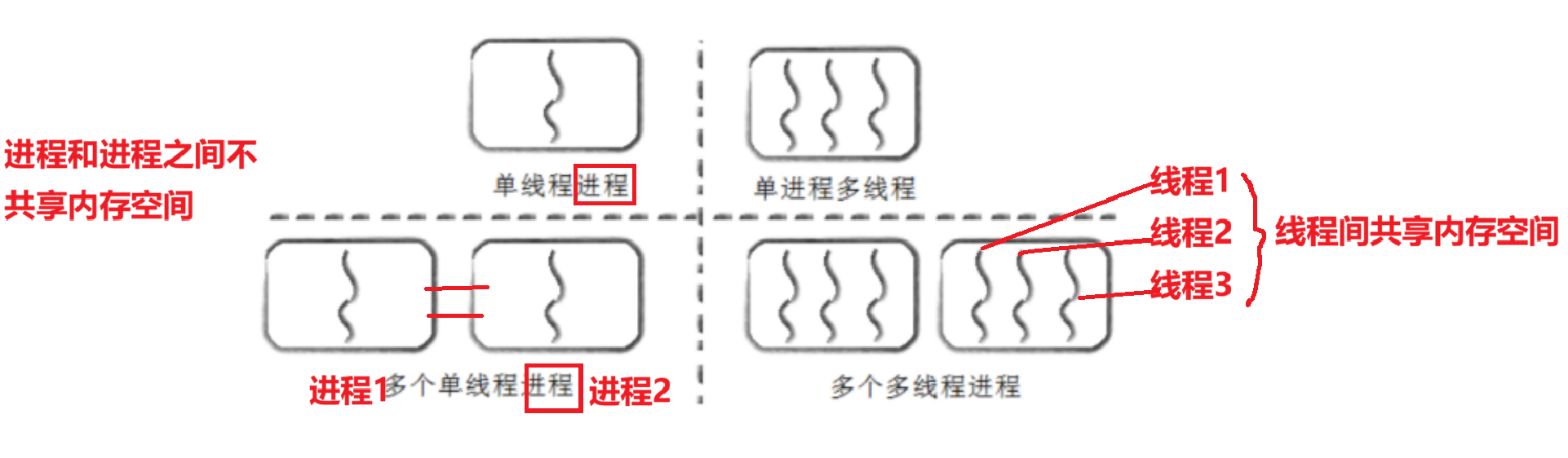 个进程崩溃). - 进程和进程 之间不共享 内存空间. 同一个进程的线程 之间共享 同一个内存空间.