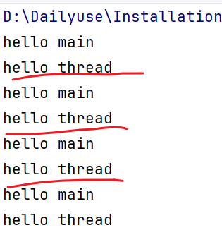 javaclass MyThread extends Thread{ @Override public void run(){ while(true){ System.out.println("hello thread"); try { Thread.sleep(1000); } catch (InterruptedException e) { throw new RuntimeException(e); } } } } public class Demo1 { public static void main(String[] args) throws InterruptedException { Thread t = new MyThread(); // t.start(); t.run(); while(true){ System.out.println("hello main"); Thread.sleep(1000); } } }如上的代码所述,只是把t.start()替换为t.run()