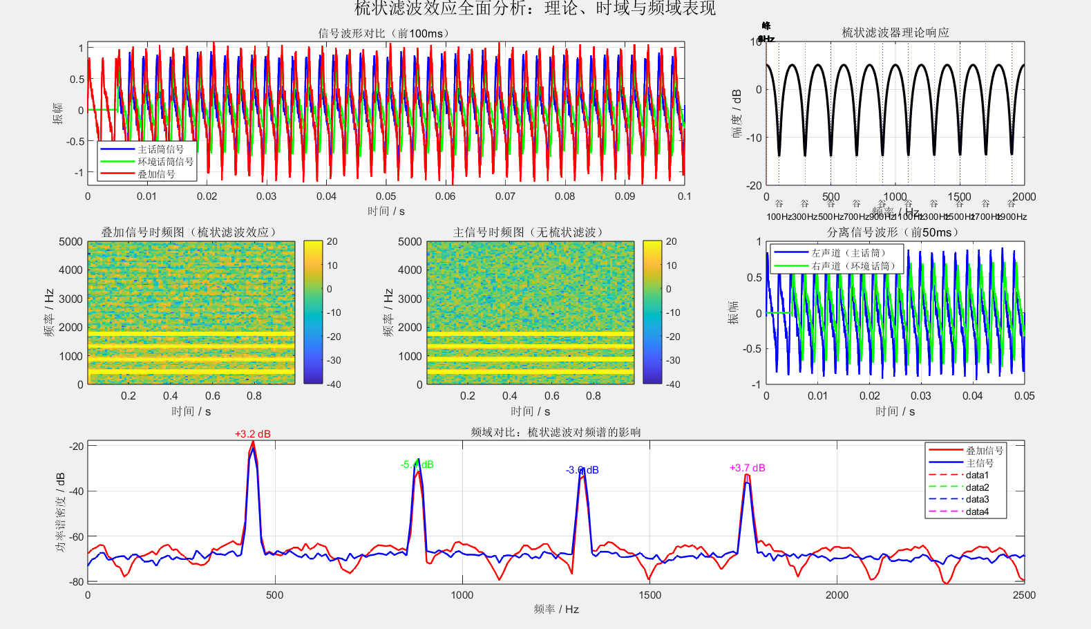 这段代码通过完整的可视化分析,展示了梳状滤波如何在时域和频域影响声音信号。运行后将生成包含六个子图的综合分析界面,清晰展示: