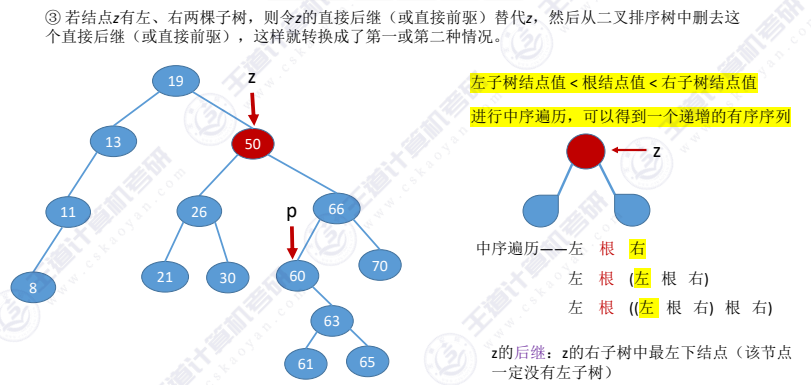 被删除结点z有2棵左右子树(直接后继替代法 )