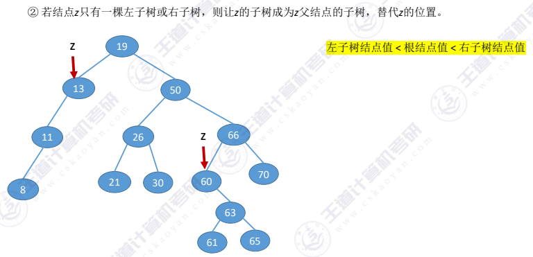 被删除结点z只有一棵左子树或右子树
