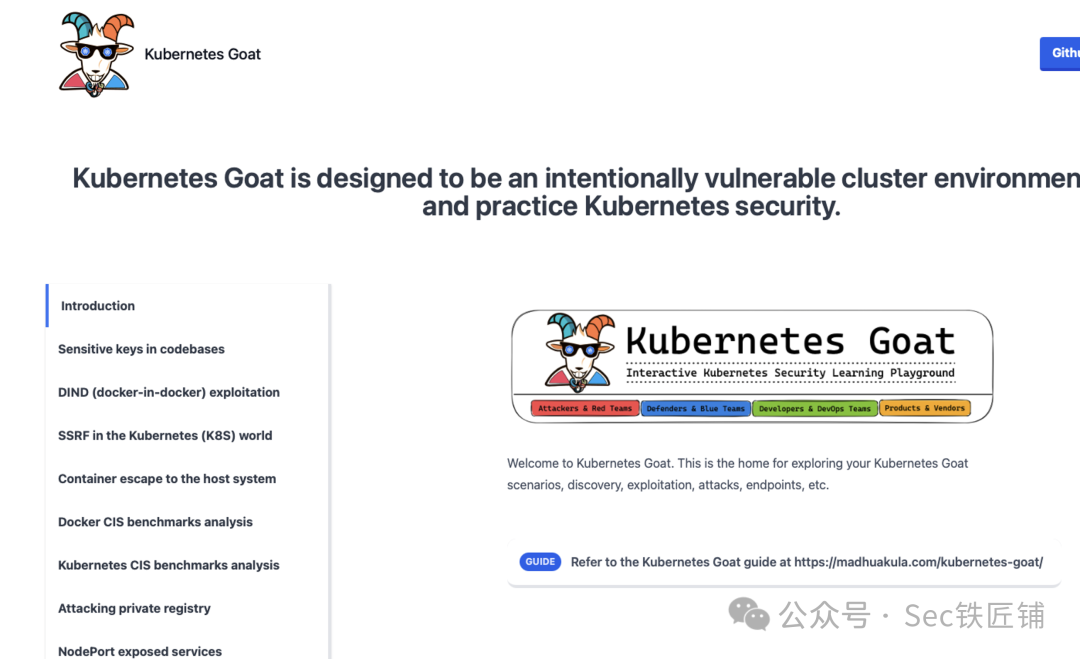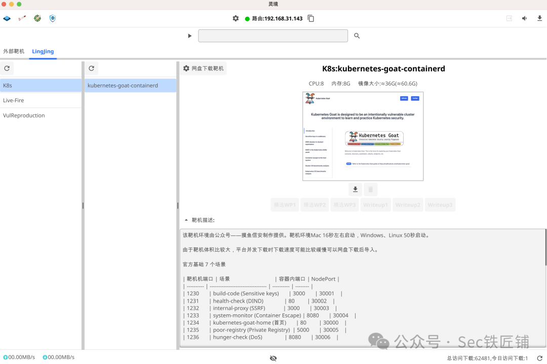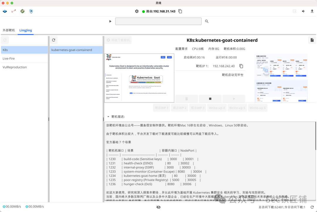 此靶机镜像由公众号摸鱼信安 制作,灵境平台 进行适配,已适配Mac arm64、Windows amd64、Ubuntu amd64物理机,使用 kind 部署的 kubernetes-goat 环境,只支持 containerd 容器,所以这套环境是 docker 部署的。(由于kubernetes-goat环境部署比较复杂,再次感谢摸鱼信安 对原项目进行改造后交由灵境平台提供给大家学习)