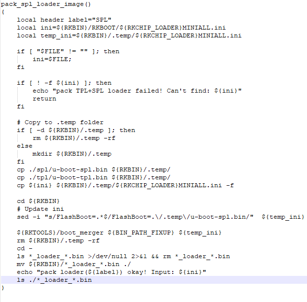 uboot使用boot_merger工具将rk3288_ddr_400MHz_v1.08.bin和rk3288_usbplug_v2.56.bin和spl组合成rk3288_loader_v1.08.256.bin文件作为引导程序,下面是从uboot的make.sh抠出来的关键脚本。