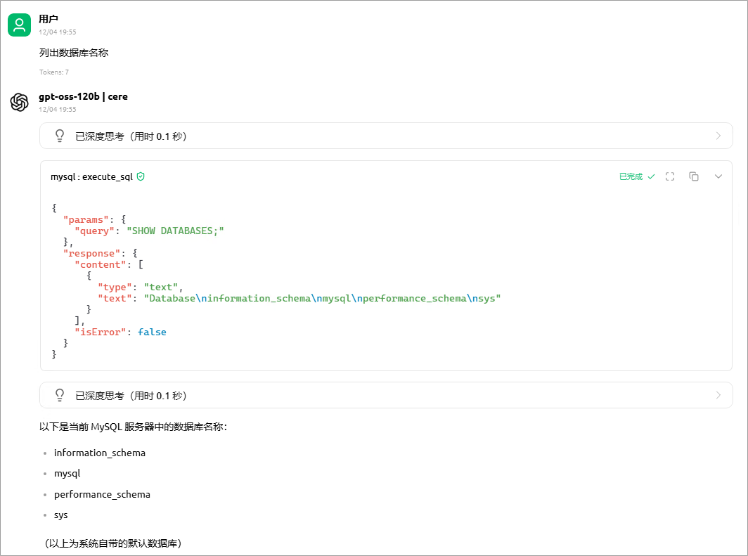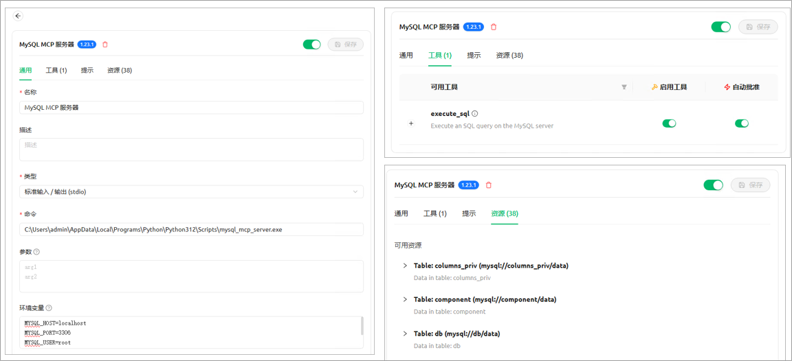 { "mcpServers": { "MySQL MCP 服务器": { "command": "C:\\Users\\admin\\AppData\\Local\\Programs\\Python\\Python312\\Scripts\\mysql_mcp_server.exe", "env": { "MYSQL_HOST": "localhost", "MYSQL_PORT": "3306", "MYSQL_USER": "root", "MYSQL_PASSWORD": "root", "MYSQL_DATABASE": "mysql" } } } } -