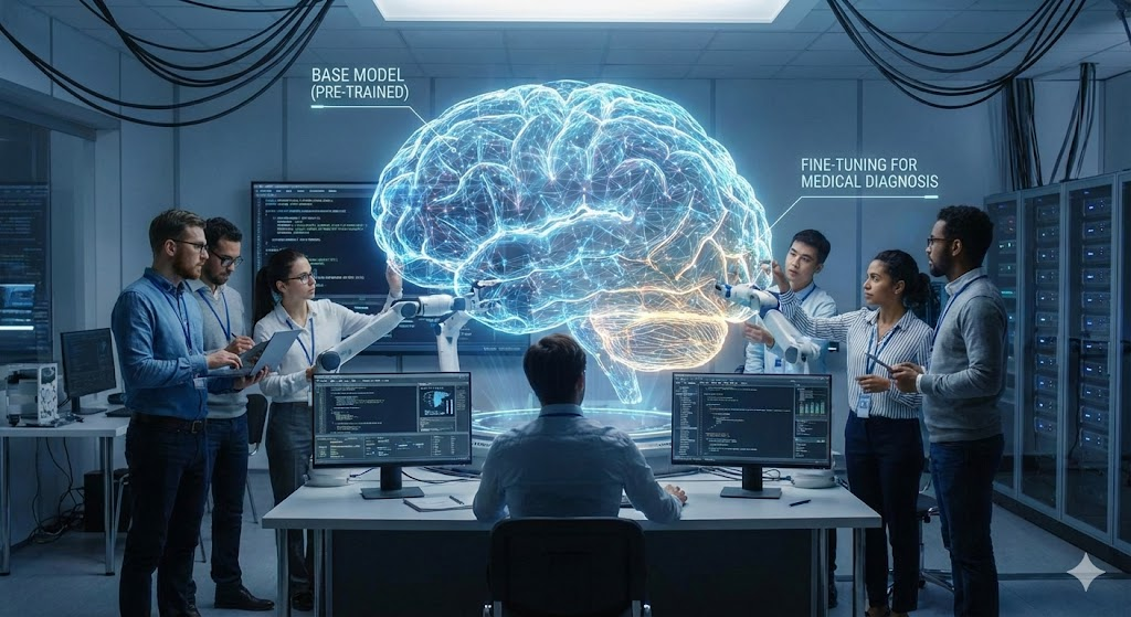 进步:有了"底座"的概念。模型先在海量数据上学好语言规律(预训练),再通过少量标注数据微调(Fine-tune)来适配特定任务。