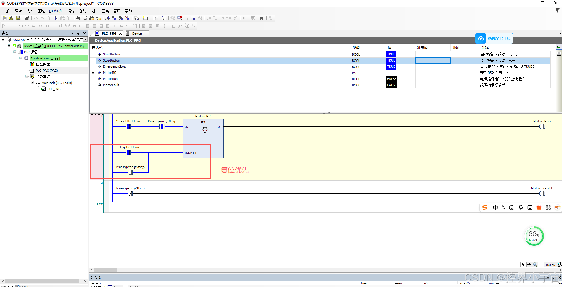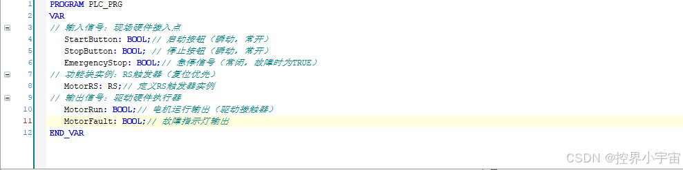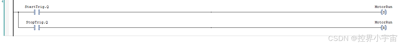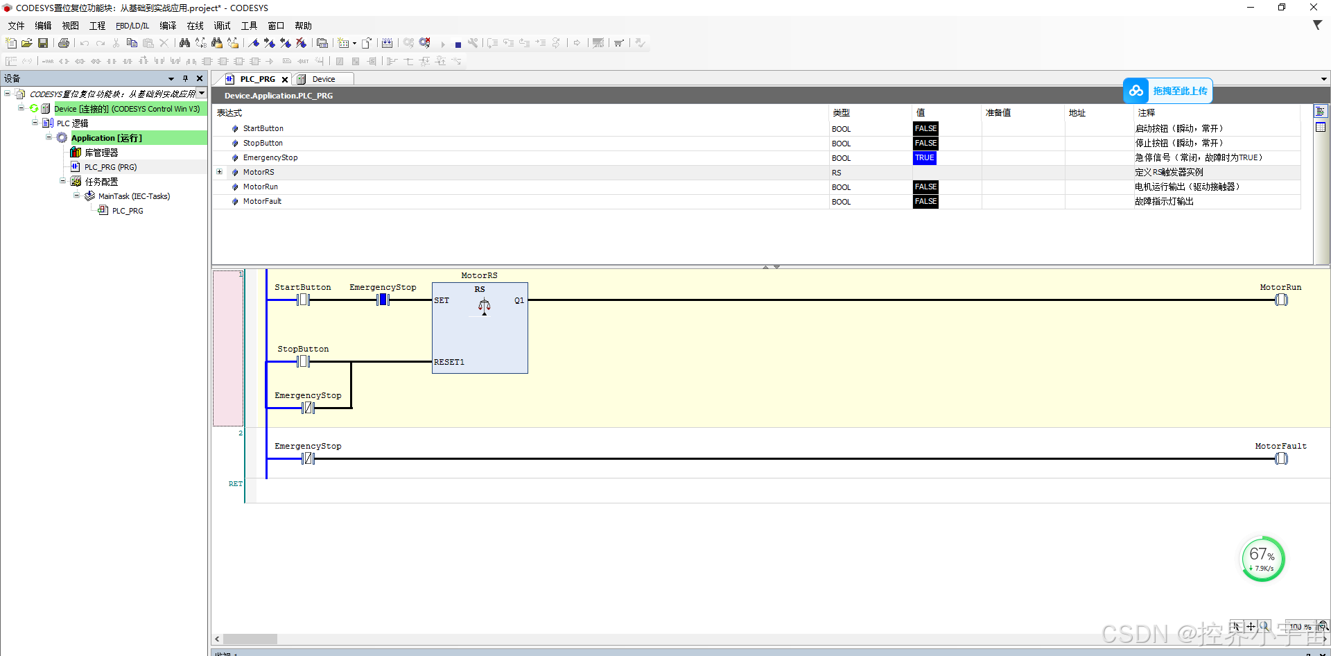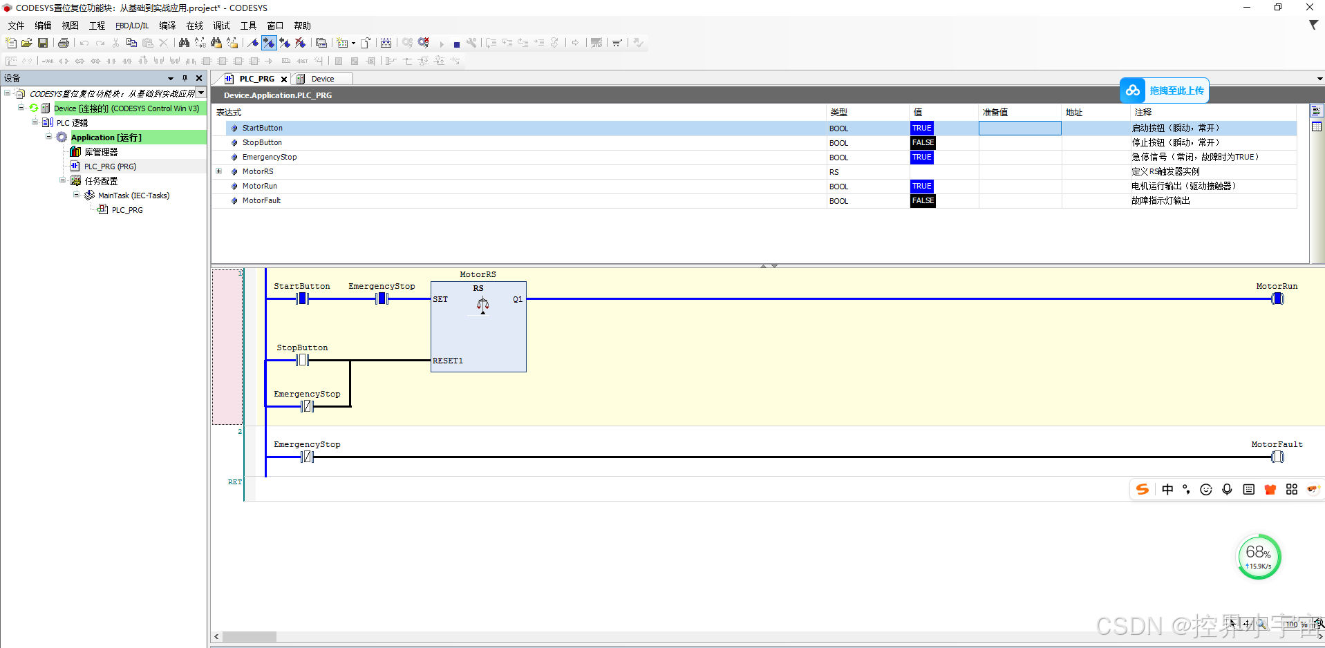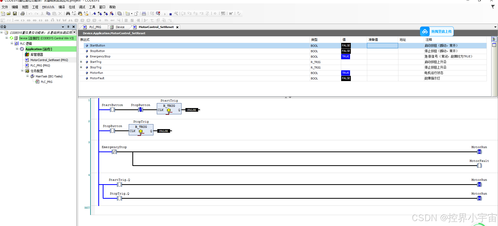 电机控制核心需求是「启动按钮瞬动触发运行,停止/急停按钮优先复位」,我们分别用RS触发器和单一置复位指令实现,对比差异。