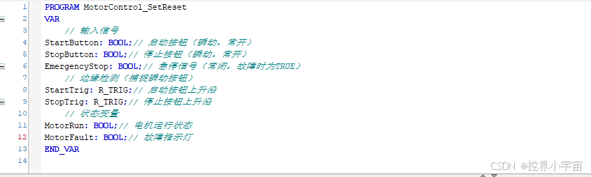 除了功能块,CODESYS还提供独立的置位(SET)和复位(RESET)指令,直接对BOOL变量进行状态锁定,语法更简洁,适合简单的单条件置复位场景: