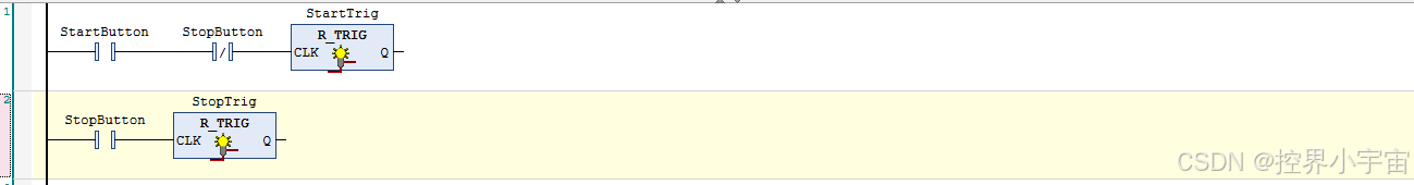 - R_TRIG(上升沿检测):仅在信号从FALSE变为TRUE的瞬间输出一个扫描周期的TRUE,用于捕捉按钮按下、状态切换等瞬动信号。