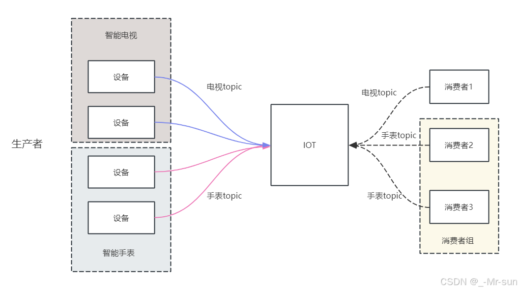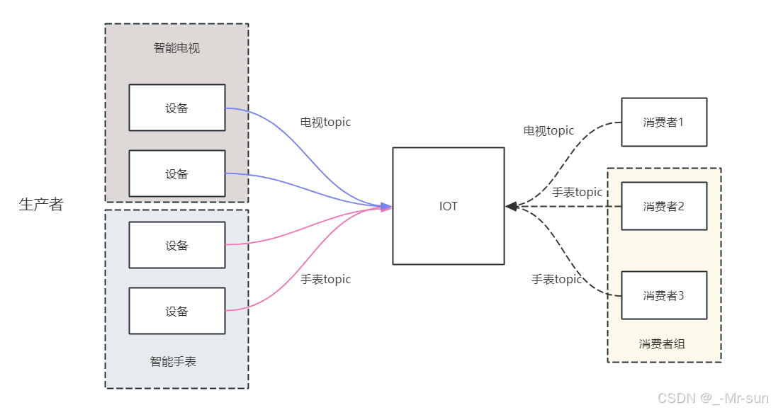 - 生产者:设备负责将消息发送到IOT中(队列)