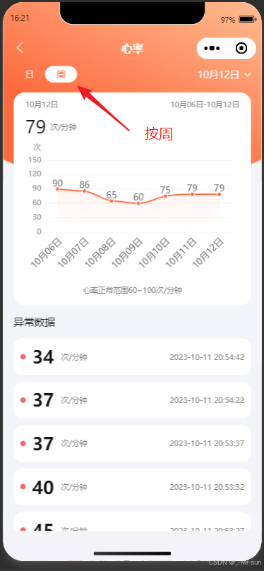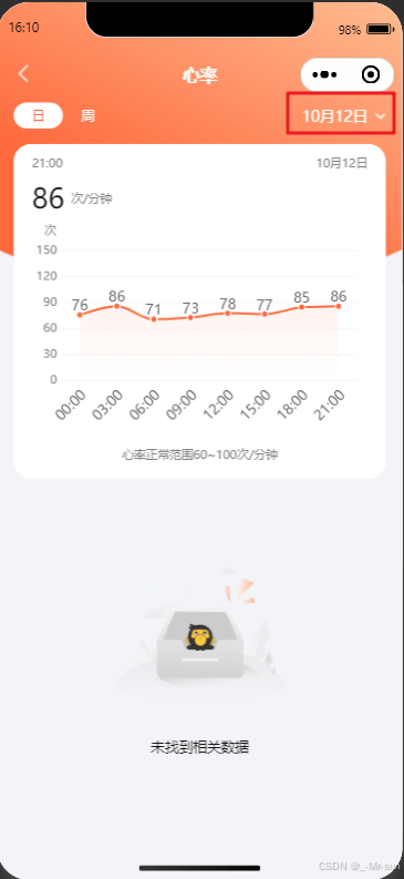 在小程序端点击心率,可以查看报表数据,也可以选择时间来进行检索,如下图