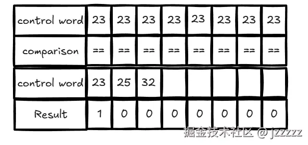 在第三步就是swiss table做的优化,一个 group有8个slot,正常是线性扫描并比较 8 个 key,但存在控制字可以进行快速比较,通过比较控制字中的每个字节为我们的h2,得到候选(一次比较同一 group 的 8 个 slot 控制字节,从而优化)