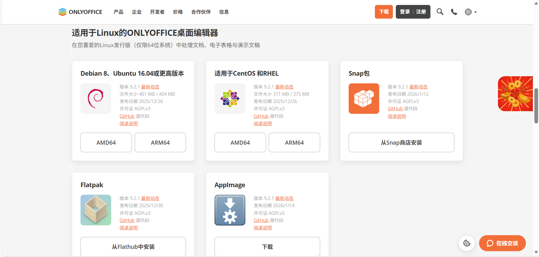 打开 ONLYOFFICE 桌面编辑器下载页面,进入 Linux 板块。