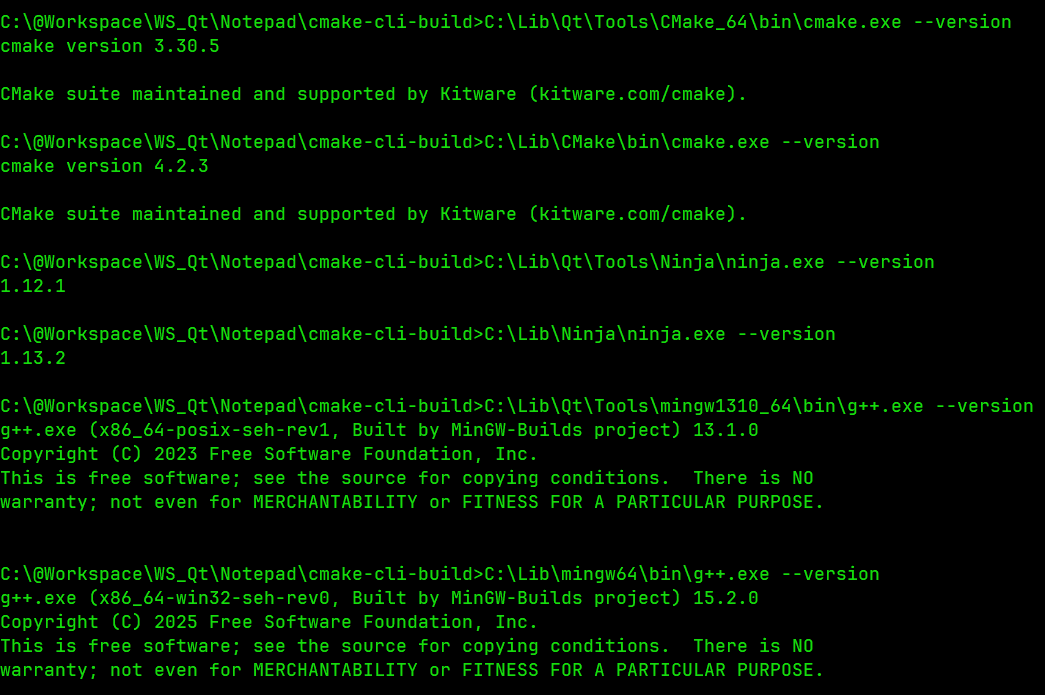 由于项目可以在 QT Creator 上正常运行,怀疑大概率是构建和编译工具的版本问题。检查了一下 QT 6.10.1 自带的 CMake、Ninja、MinGW 本地安装的这三个工具的版本: