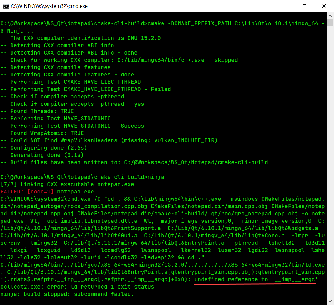 一个确定没有语法错误的QT项目(使用 QT Creator 可运行),在本地使用命令行手动构建时报"undefined reference to `__imp___argc'"错误:
