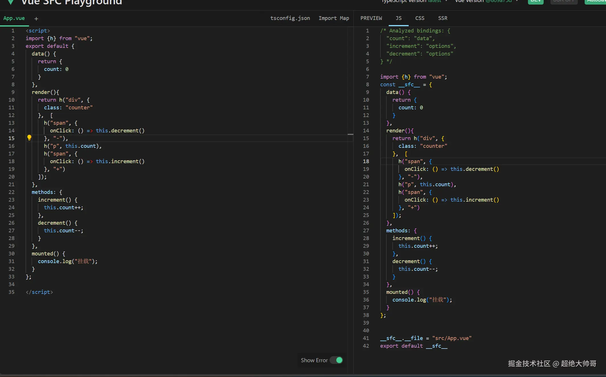 可以看到生成了render函数,这个render函数是可以直接被运行时的vue包执行的,不需要加入编译器,所以可以看到有没有render是两回事,有render就直接使用render,没有render,那么就会读取template字符串, 这个时候就需要编译器了 , 我们在这里尝试把上面在选项式API部分里写的例子用render函数写一遍, vue给我们提供了一个名为h函数的api,专门用于给开发者手动的编写render函数,具体可以看 [h函数](渲染选项 | Vue.js), 改写后的例子如下