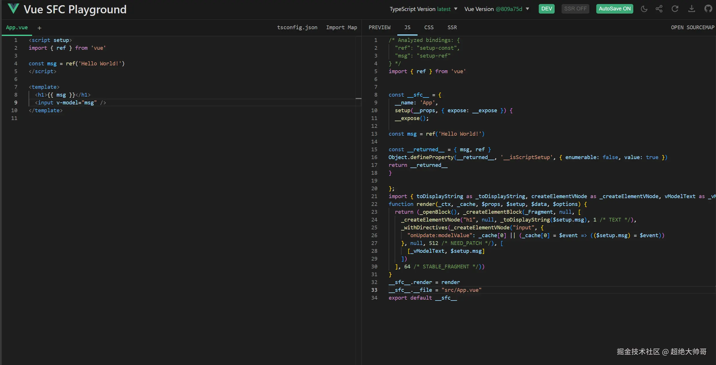 可以看到,SFC编译插件基于没有做什么更改,我们可以直接把这个App组件配合vue运行时的版本使用,看下面的html代码