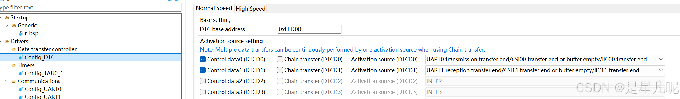 分别配置两个DTC为UART0发送结束触发和UART1接收完成触发,当对应的发送与接收数据缓冲寄存器被填充的时候触发DTC,DTC再将源地址的数据搬运到目标地址上面。宏观来看,对于UART的发送接收而言,其触发源为发送传输结束与接收传输结束。