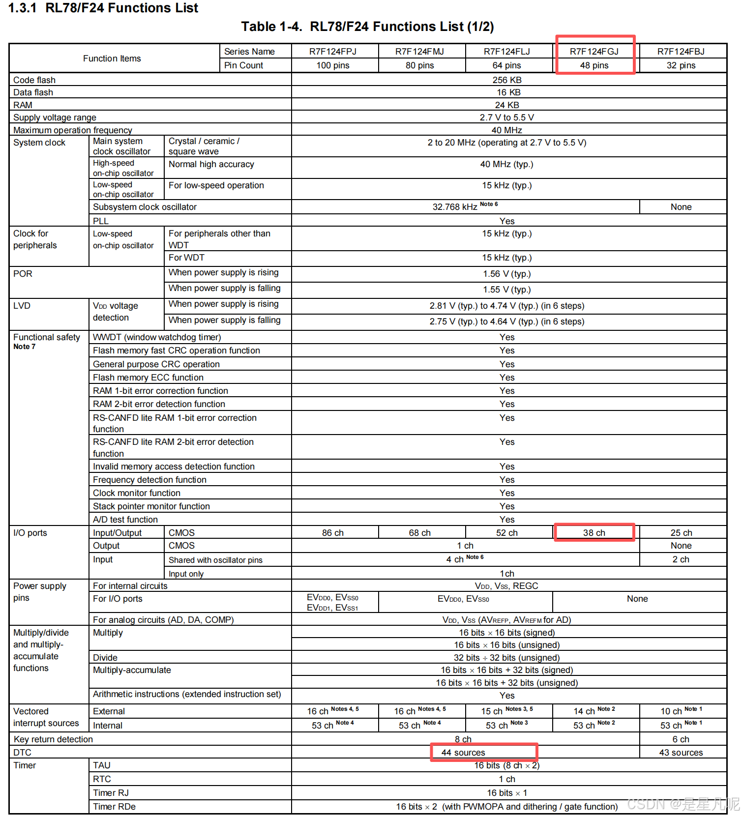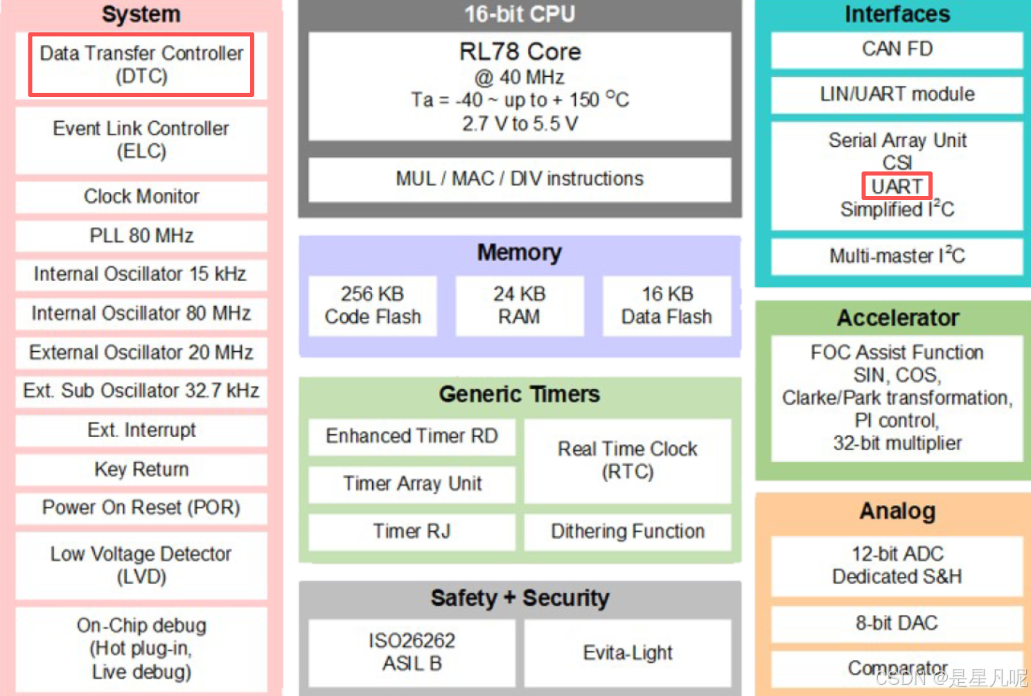 当然,要配置RL78F24的UART的DTC,我们首先得了解一下这款MCU的基本外设分布情况