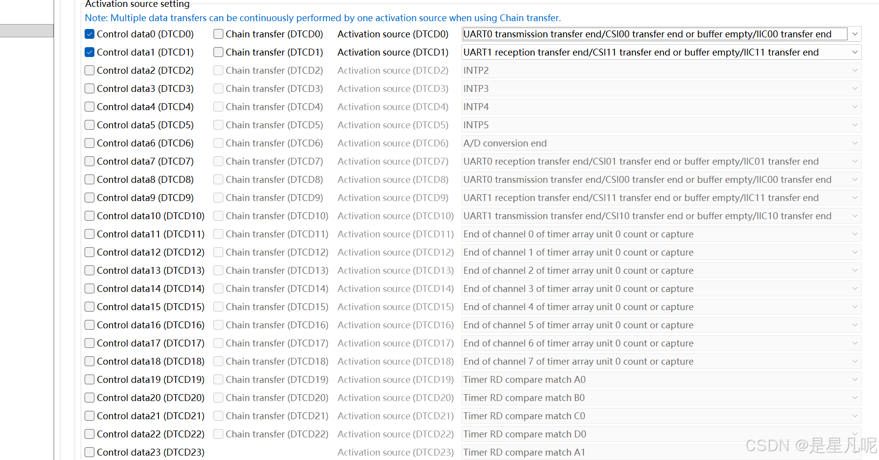 UART1从上位机发送数据到MCU,因此DTCD1的激活源设置为UART1接收传输结束
