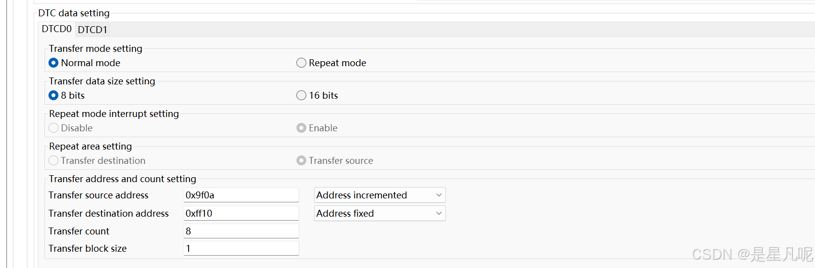 以上配置的是normal模式的时候,DTC搬运一次数据之后就会将计数值归零,要再次搬运就是需要重新设置地址与传输的数据大小。当设置成repeat模式的时候,再次传输的时候可以不用再重载设置地址与传输数据大小,除了对应的Repeat area setting项对应选择的地址的首8BIT是00之外,其他的均不变,不需要再次重载。
