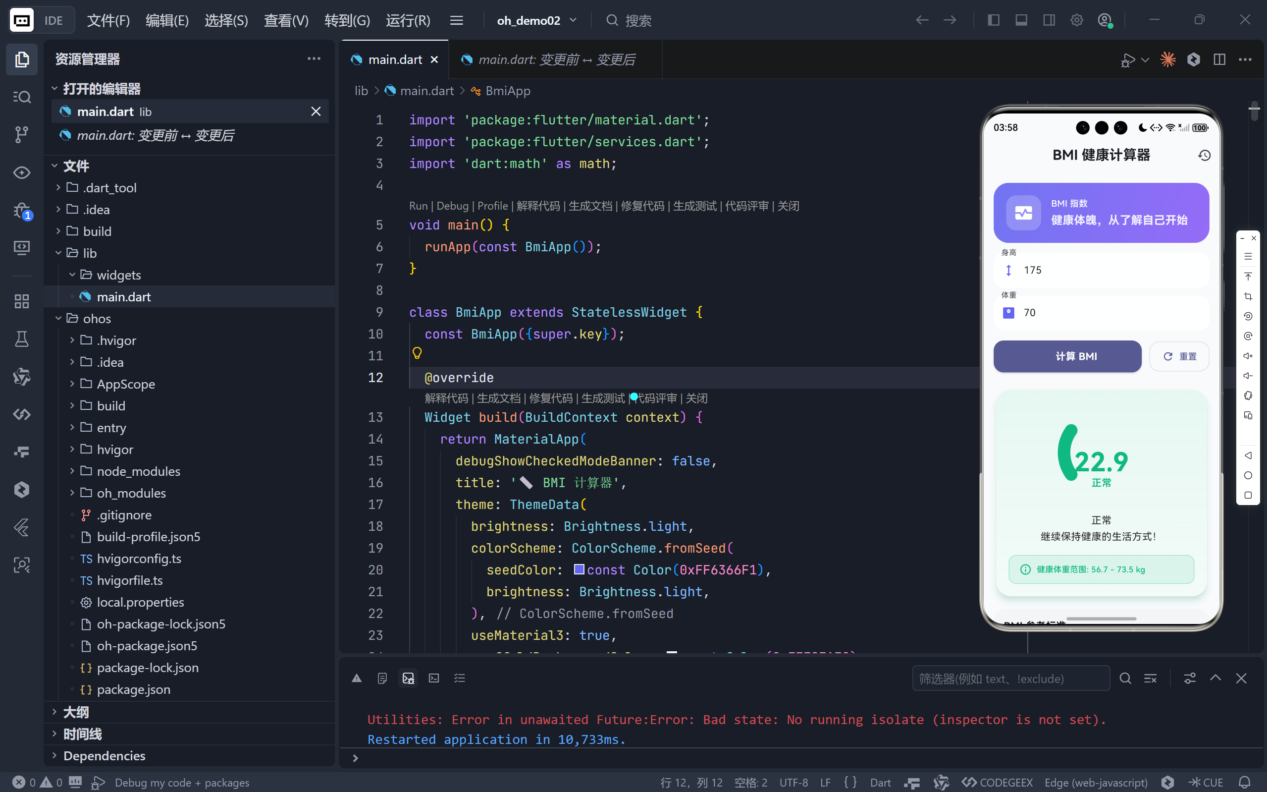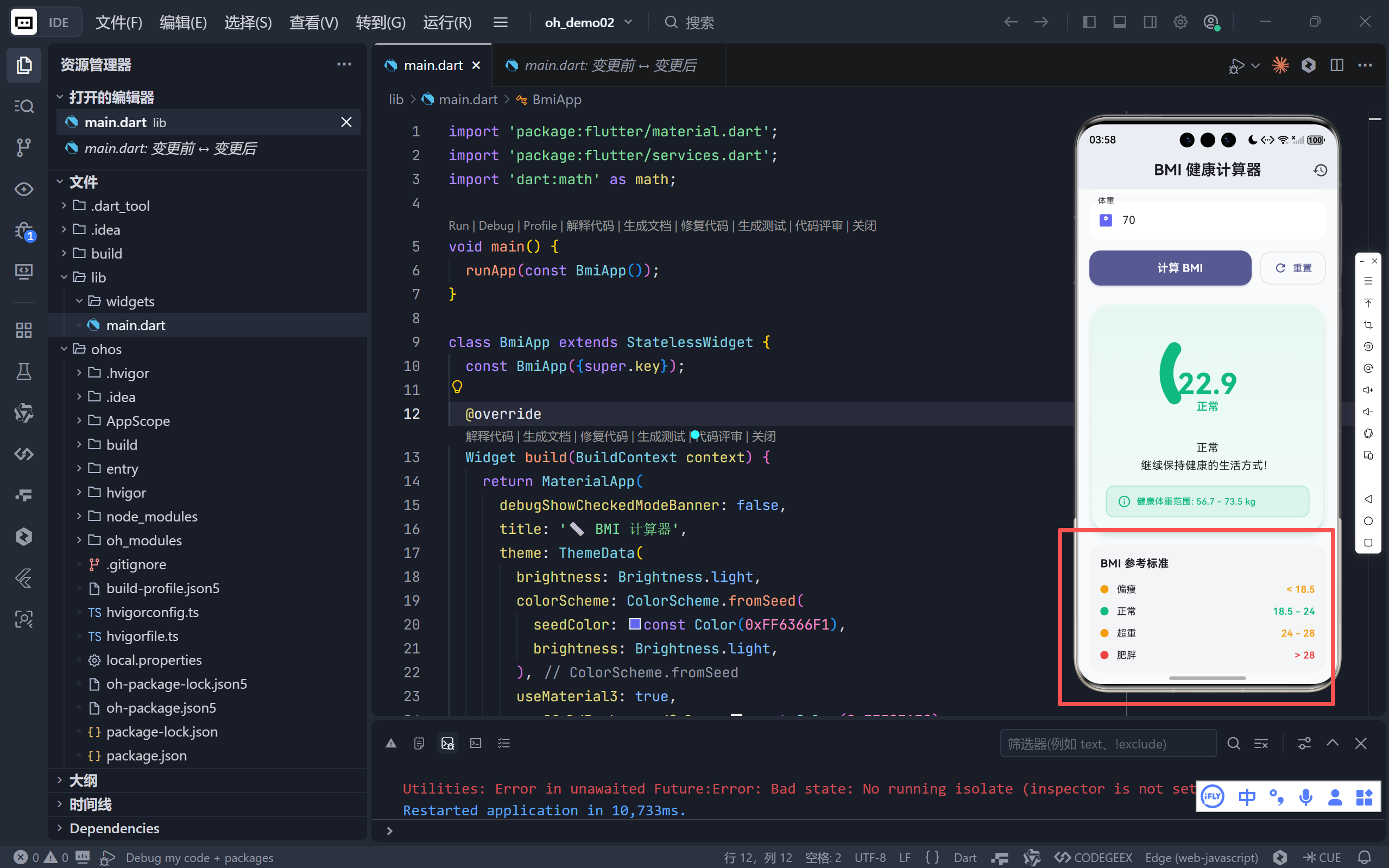 在上一篇《Flutter BMI 健康计算器:打造支持深色模式的智能健康工具》中,我们实现了一个功能完整、主题适配良好的基础版本。而今天这份代码,则是一次全方位的专业级升级 ------它不仅保留了原有优点,更引入了动画增强、数据持久化、历史记录、可视化仪表盘、响应式布局等高级特性,将一个简单的计算工具转变为真正有温度、有记忆、有洞察的健康助手。