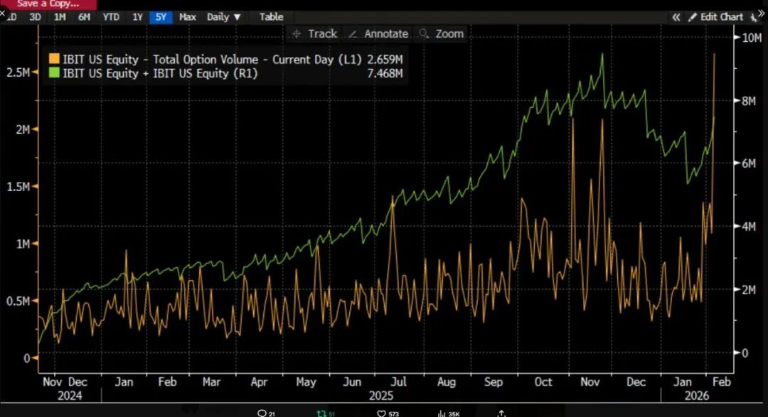 随着时间的推移和更多数据的披露,情况已日趋明朗:在资本市场经历了最为惨烈的一天之际,此次猛烈抛售与比特币ETF存在某种关联。我们之所以知道这一点,是因为 IBIT(贝莱德比特币ETF)出现了创纪录的交易量(超过100亿美元,是此前高点的2倍,这确实是一个惊人的记录),以及历史性的期权成交量活动(见下文------这是该ETF自上市以来最高的合约数量)。或许相对于过去的活动略显不同寻常的是,鉴于交易量的不平衡,我们可以观察到期权活动主要是由看跌期权(Puts)而非看涨期权(Calls)主导的。