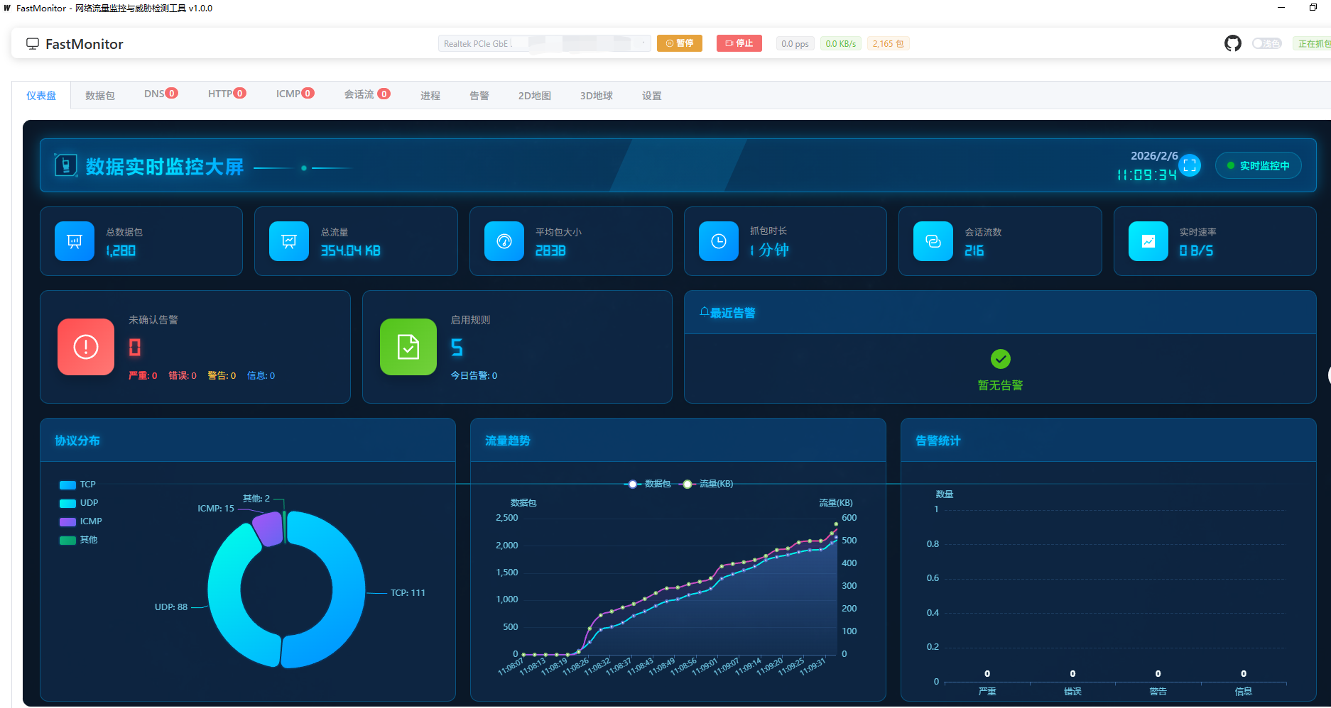 采用gopacket/pcap库实现高性能数据包捕获,支持TCP/UDP/ICMP/HTTP/DNS等协议解析。实时展示协议分布、流量趋势、数据包数量等关键指标,通过可视化图表呈现网络通信状态。