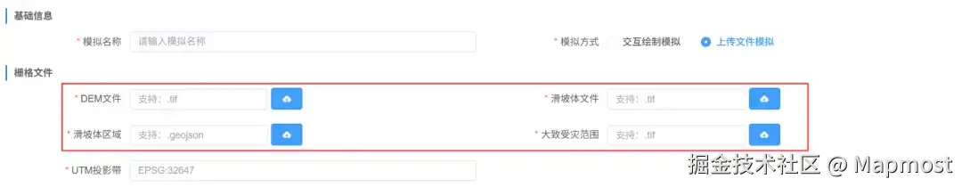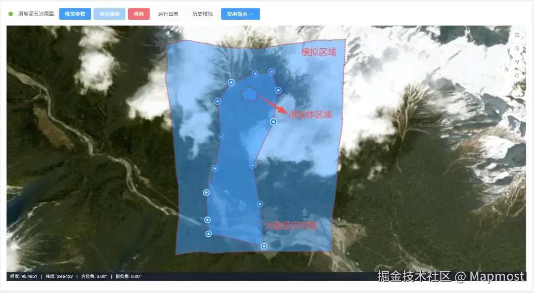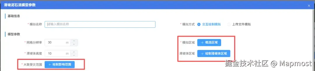 我们在文件驱动功能的基础上,做了进一步升级,用户只需要在地图上直接框选或绘制**"模拟区域"、"滑坡体区域"、"大致受灾范围"**这三个区域就可以实现模拟,这样大大提高了操作的便利性,降低了对专业的依赖。