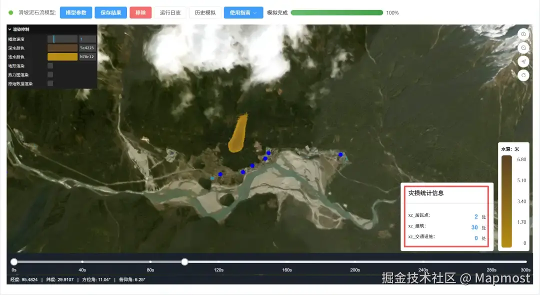 在实际应用中,Mapmost RiskInsight 还支持在仿真模拟基础上,进行"承灾体脆弱性分析":用户可以上传承灾体数据(包括建筑、道路、居民点等),用来分析在滑坡泥石流演进过程中,是否会影响到某个承灾体,并对其造成物理破坏,最终显示统计信息(如下图所示)。同时管理者可以看到承灾体在地图上的分布,从而对人员撤离、拦挡工程修建等预案的制定提供科学可靠的依据。