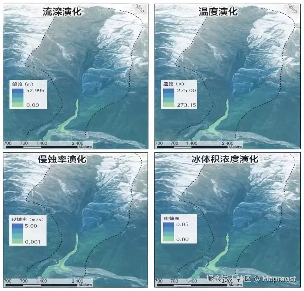 #从视频中可以看出,模型计算并模拟出了泥石流的运动方向和速度